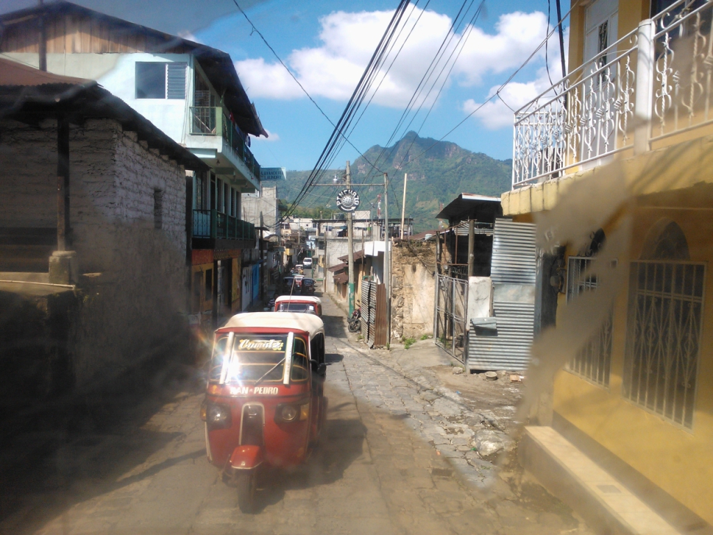 Najlepsze przed nami, jedziemy z localsami do Lago de Atitlan. Nie jest to takie proste, ponieważ nie ma bezpośredniego autobusu z Antigua-y do Panajachel, jednak jesteśmy zapewniani, że autobus do którego wsiedliśmy jedzie tam gdzie chcemy. Dookoła nas dźwięki jakiegoś latynoskiego gwiazdora klasy B i tubylcy czekający na odjazd lub sprzedający wszystko co można wymarzyć, np. długopisy z kalendarzem i latarką, lekarstwa na raka, wypadanie włosów, ale głównie jedzenie. Po chwili autobus jest pełny i siedzimy jak sardynki po trzy osoby na jednym siedzeniu. Aby dojechać do Panajachel musimy zmienić autobus jeszcze 4 razy, naszczęście po wjeździe na panamericanę autobus jest pustszy i mamy całe siedzenie dla siebie (co już nam się nigdy później nie zdażyło).
